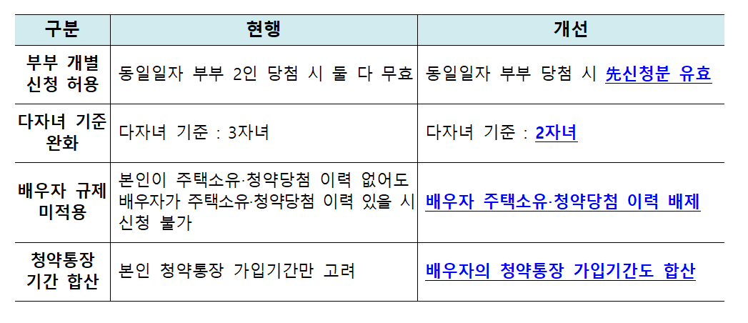 다자녀 기준은 2자녀로 낮췄고, 배우자의 결혼전 주택소유·당첨 이력을 배제해준다고 합니다.