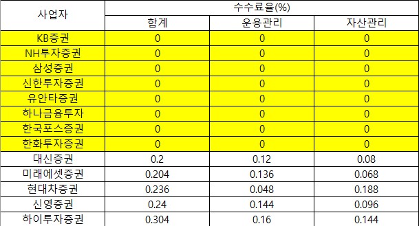 증권사 중에서는 KB증권, NH투자증권, 삼성증권, 신한투자증권, 유안타증권, 하나금융투자, 한국포스증권, 한화투자증권 이 수수료가 0 인 것으로 확인되었습니다.